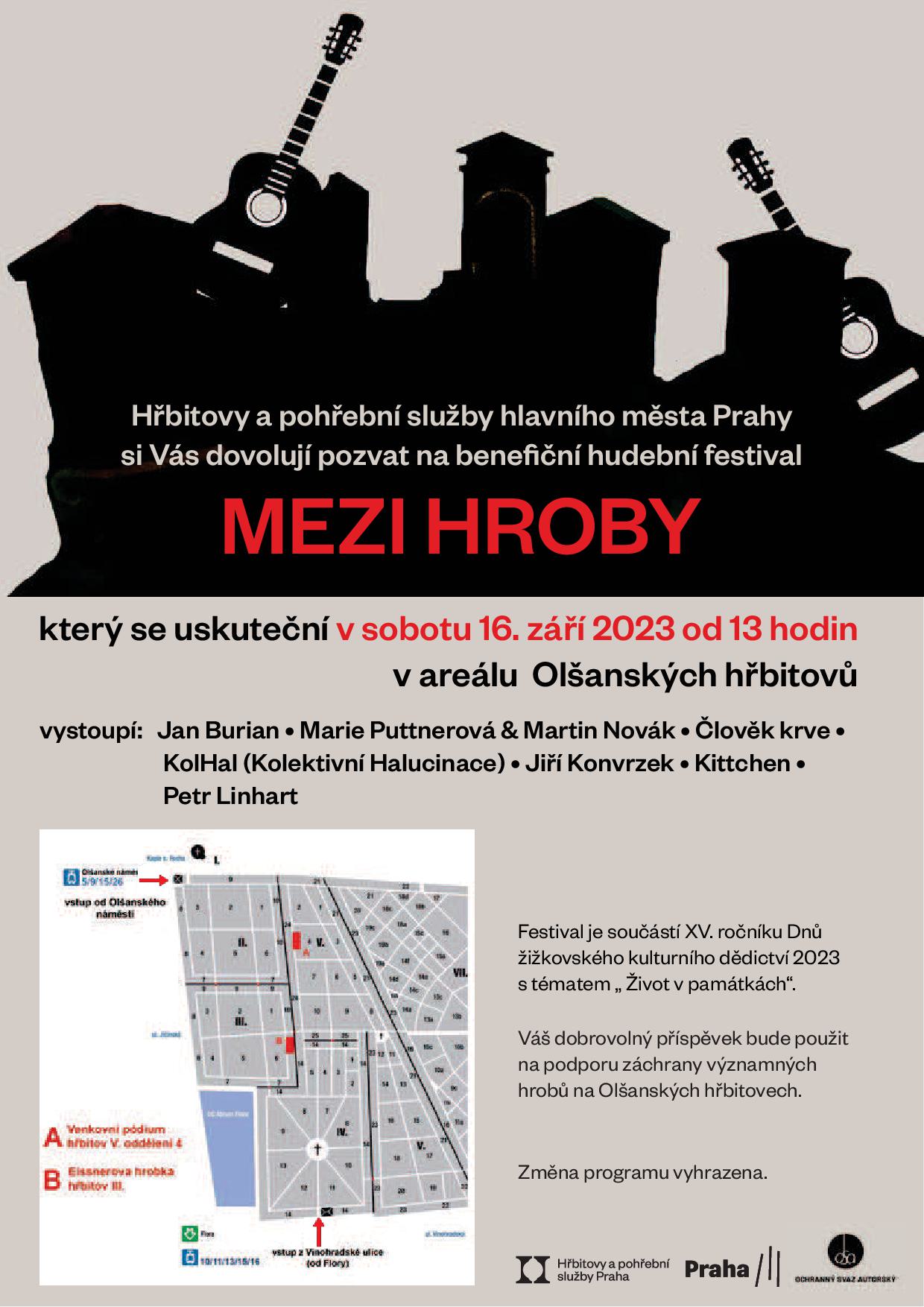 Zveme Vás na jedinečnou kulturní událost, jednodenní hudební festival, který spolu s městskou částí Praha 3 pořádáme v sobotu 16. 9. 2023 ve staré části Olšanských hřbitovů. Věříme, že kombinace (převážně) akustické hudby a nepřenositelné atmosféry starého hřbitova se vzrostlými stromy a břečťanem porostlými náhrobky si Vás získá. Vstupné je dobrovolné; výtěžek poputuje na záchranu cenných hrobů na Olšanských hřbitovech.