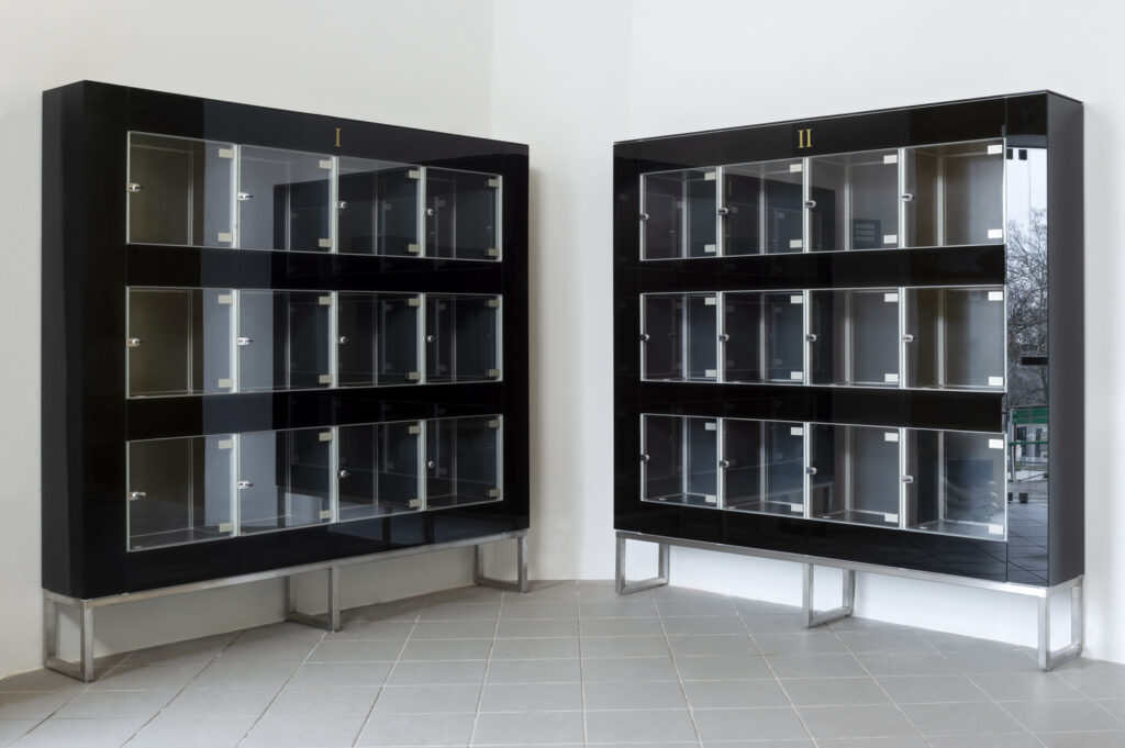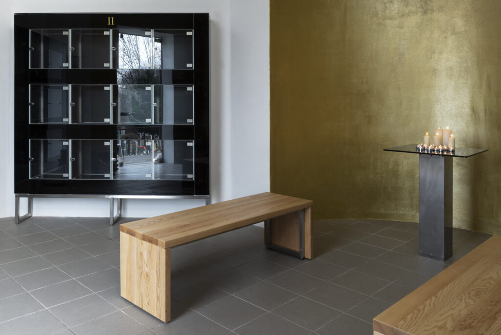 Nábytkové vybavení bylo navrženo velmi jednoduše a funkčně. Čtyři skříně s 48 kolumbárními schránkami jsou sestaveny z hliníkového modulárního systému opláštěného černým opakním sklem. Dřevěné lavice podporují symetrii prostoru. V centrální apsidě je umístěn skleněný podstavec přednostně určený pro instalaci svíček jako vzpomínky na zesnulé.