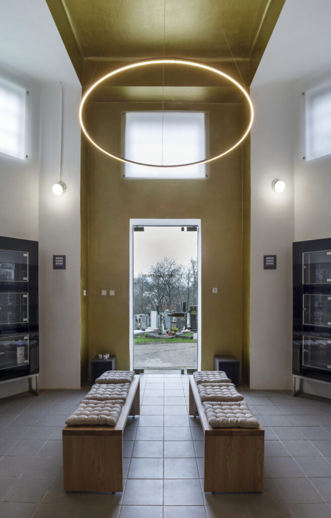 Na půvabném jinonickém hřbitově jsme v historické budově bývalé márnice vytvořili moderní kolumbárium, které nabízí vznosný prostor s charakterem kaple, minimalistické designové schránky a jednoduché posezení pro tichou, nerušenou vzpomínku.