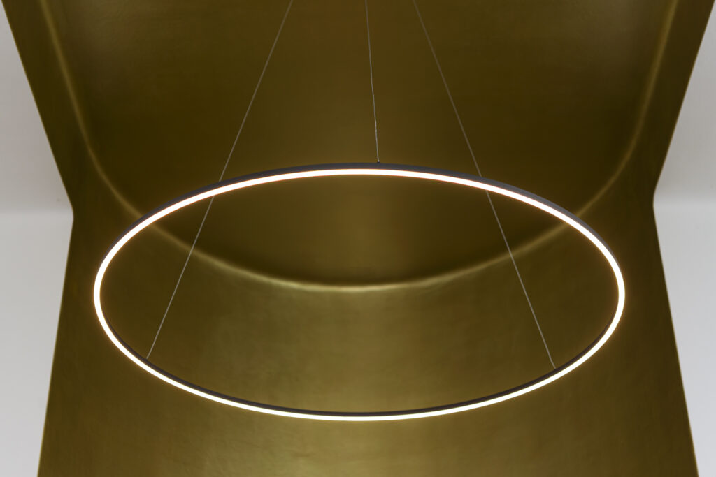 Interiér je decentně vymalován v kombinaci bílé a metalické zlaté barvy, okenní otvory jsou překryty průsvitnými panely. Centrální svítidlo má tvar zářící obruče a je zavěšeno ze stropní klenby. Vstupní (zamykatelné) dveře z bezrámových skleněných desek kolumbárium vizuálně propojují s hřbitovem a vybízejí návštěvníky, aby nahlédli dovnitř.