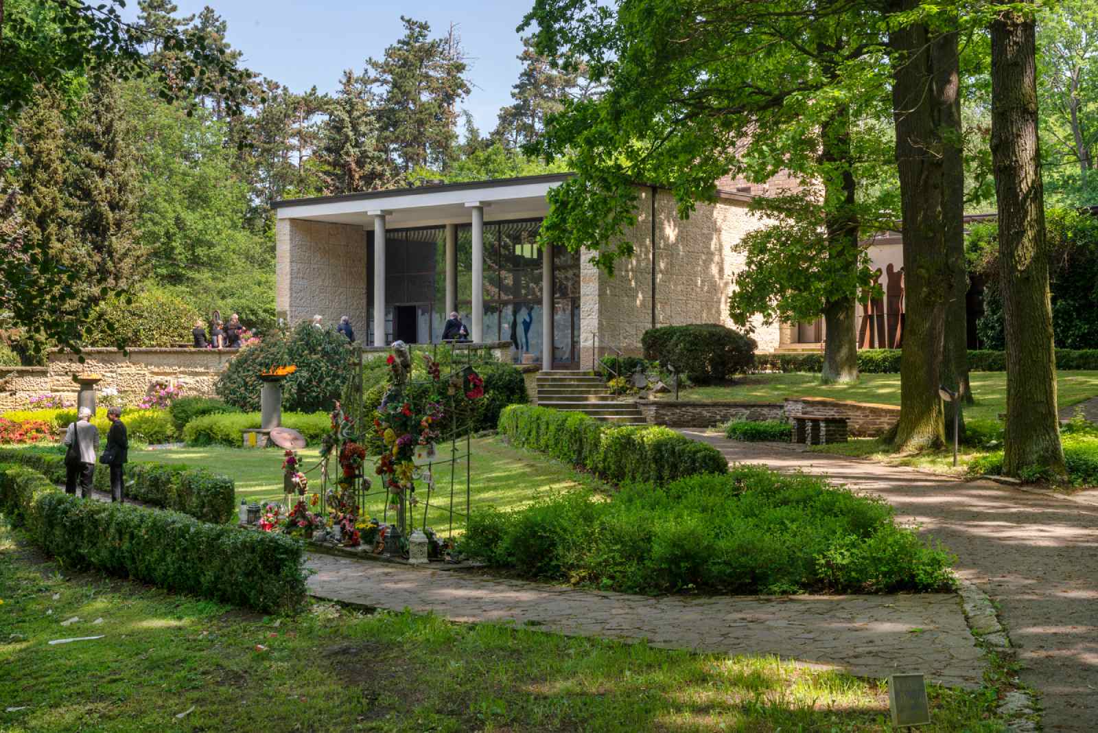 Součástí areálu je také hřbitov o rozloze 39,5 tis. m2, který je koncipován výhradně pro uložení zpopelněných ostatků. Dispozici pohřebiště navrhl rovněž arch. Josef Karel Říha. V areálu je umístěna socha Dohasínající krása Vilíma Amorta (1864–1913) z roku 1913 a u vstupní brány pak monumentální pískovcová socha Bol od Miloslava Hejného (1925–2013) z roku 1955. Plochu hřbitova kromě samotného krematoria tvoří urnový háj, umělé jezírko, dvě rozptylové loučky, vsypové loučky, čestné pohřebiště popravených obětí III. odboje, kolumbária a pohřebiště vojáků Wehrmachtu. V současnosti je na tomto hřbitově 5 419 míst pro uložení uren do urnových hrobů a 1 332 míst ve 444 kolumbárních schránkách.